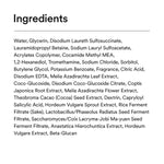 Water, Glycerin, Disodium Laureth Sulfosuccinate, Lauramidopropyl Betaine, Sodium Lauryl Sulfoacetate, Acrylates Copolymer, Cocamide Methyl MEA, 1,2-Hexanediol, Tromethamine, Sodium Chloride, Sorbitol, Butylene Glycol, Potassium Benzoate, Fragrance, Citric Acid, Disodium EDTA, Melia Azadirachta Leaf Extract, Coco-Glucoside, Disodium Coco-Glucoside Citrate, Coptis Japonica Root Extract, Melia Azadirachta Flower Extract, Theobroma Cacao (Cocoa) Seed Extract, Dextrin, Capryloyl Salicylic Acid, Hordeum Vulgare Sprout Extract, Rice Ferment Filtrate (Sake), Lactobacillus/Phaseolus Radiatus Seed Ferment Filtrate, Saccharomyces/Coix Lacryma-Jobi Ma-yuen Seed Ferment Filtrate, Anastatica Hierochuntica Extract, Hordeum Vulgare Extract, Beta-Glucan