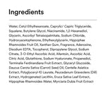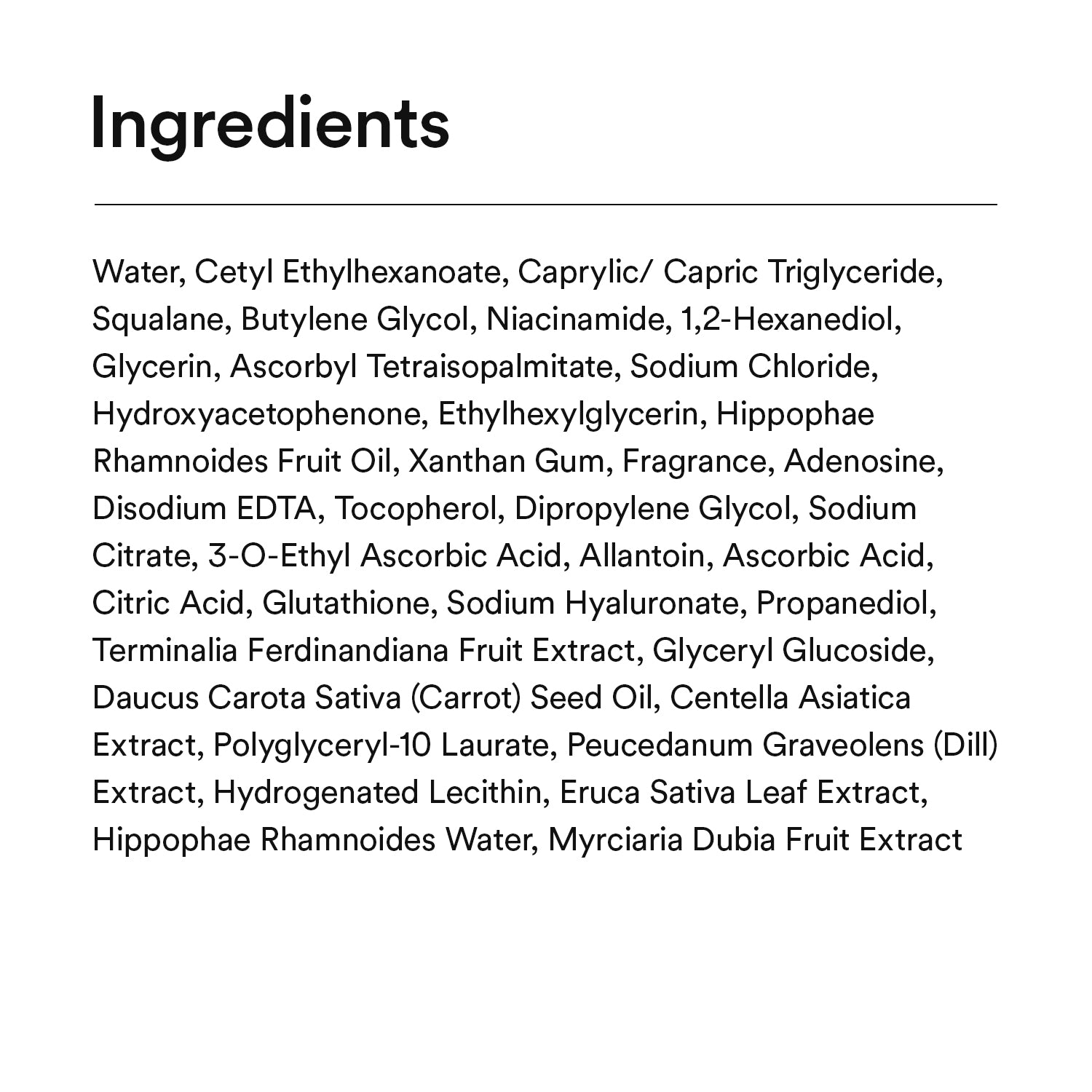Water, Cetyl Ethylhexanoate, Caprylic/Capric Triglyceride, Squalane, Butylene Glycol, Niacinamide, 1,2-Hexanediol, Glycerin, Ascorbyl Tetraisopalmitate, Sodium Chloride, Hydroxyacetophenone, Ethylhexylglycerin, Hippophae Rhamnoides Fruit Oil, Xanthan Gum, Fragrance, Adenosine, Disodium EDTA, Tocopherol, Dipropylene Glycol, Sodium Citrate, 3-O-Ethyl Ascorbic Acid, Allantoin, Ascorbic Acid, Citric Acid, Glutathione, Sodium Hyaluronate, Propanediol, Terminalia Ferdinandiana Fruit Extract, Glyceryl Glucoside, Daucus Carota Sativa (Carrot) Seed Oil, Centella Asiatica Extract, Polyglyceryl-10 Laurate, Peucedanum Graveolens (Dill) Extract, Hydrogenated Lecithin, Eruca Sativa Leaf Extract, Hippophae Rhamnoides Water, Myrciaria Dubia Fruit Extract